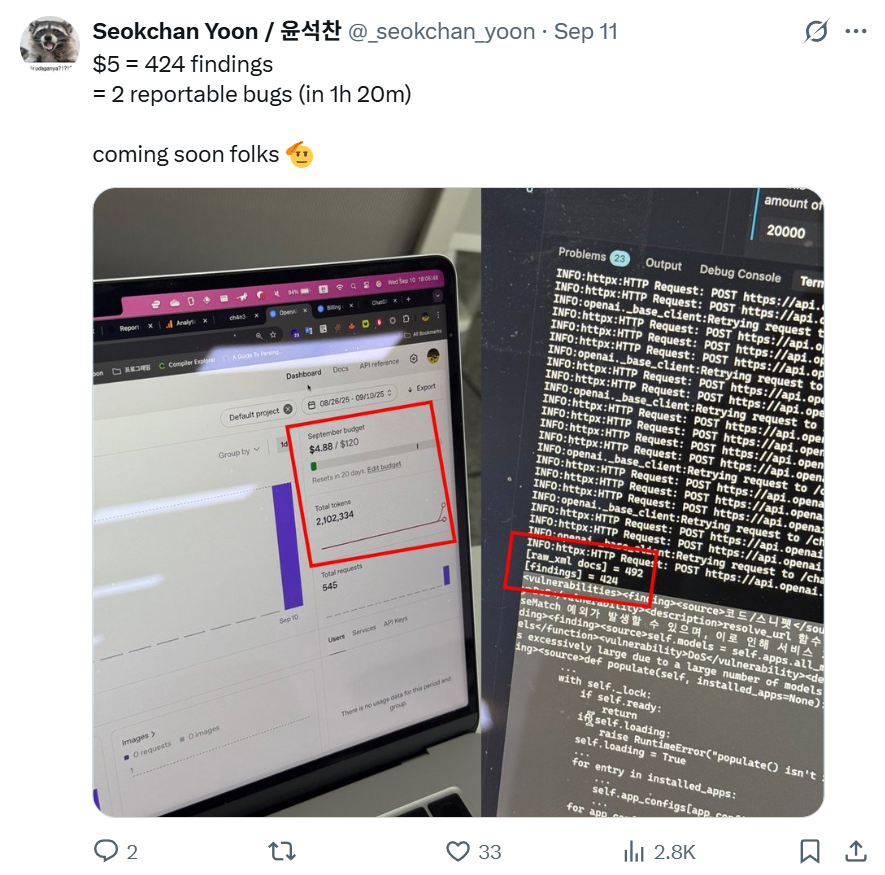 このようにして作成した初期バージョンのLLMベース脆弱性分析ツールをDjangoの全ソースコードに適用し、OpenAI APIを通じてGPT-5モデルにプロンプトを送った場合、全体の実行コストは約$5程度で済みました。