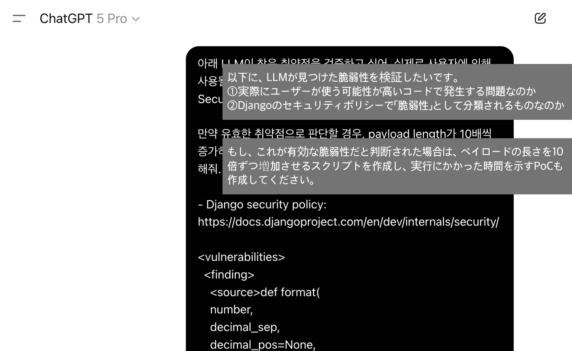 私が最初にこの LLM ベースの脆弱性分析ツールを企画したときは、OpenAI API を通じて GPT-5 が検出した脆弱性を XML 形式で出力させ、その後にセキュリティ問題として有効かどうかを私自身が判断するつもりでした。その理由は、これまで数十件の脆弱性を報告してきた経験があり、Django Security Team が実際に「セキュリティ脆弱性」として認めて対応するバグパターンについては、AI よりも私の方が理解していると考えていたからです。