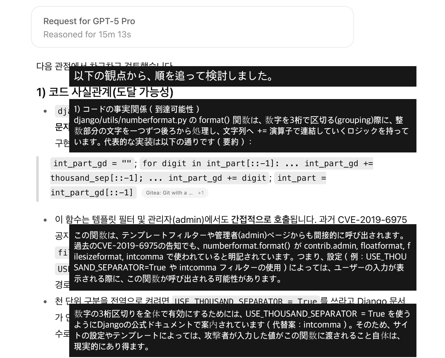 疑わしいコードセグメントを集めてみたところ、予想以上に自分が見落としていた部分が多いことに気づきました。数年間Djangoのソースコードを読み込んできた中で、もう脆弱性は出てこないだろうと思っていた領域から、GPT-5モデルがそれらしく見えるセキュリティ問題を見つけてきたのを見て、本当に驚きました。