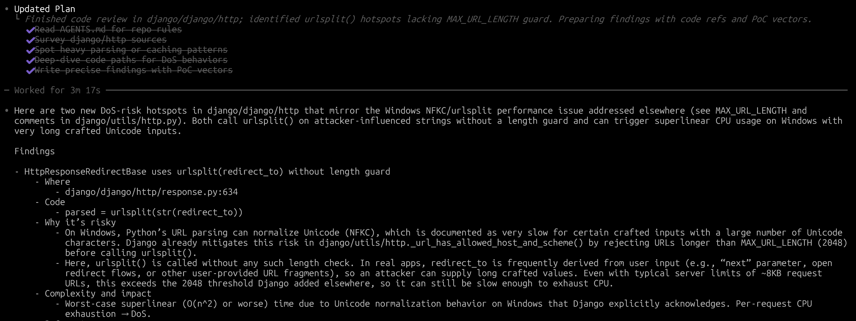 Codex が発見したセキュリティ問題を簡単にまとめると、Django で HttpResponseRedirectBase クラスを基盤とするレスポンスを送信する際、URL を処理する過程に長さの検証がなく、その結果 URL のホスト名を処理する部分で潜在的に denial-of-service が発生し得る というものでした。