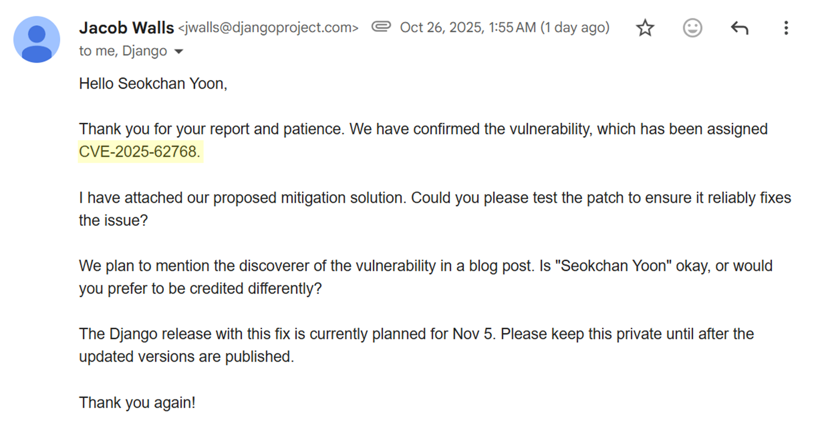 この脆弱性は CVE-2025-62768 として正式に登録され(しかし、何らかの理由でCVE-2025-64458に変更されました。)、Django チームはこの問題を「中程度の深刻度を持つ denial-of-service 脆弱性」と評価しました。その結果、HackerOne で $2,163 の報奨金を受け取れる脆弱性として認められました。