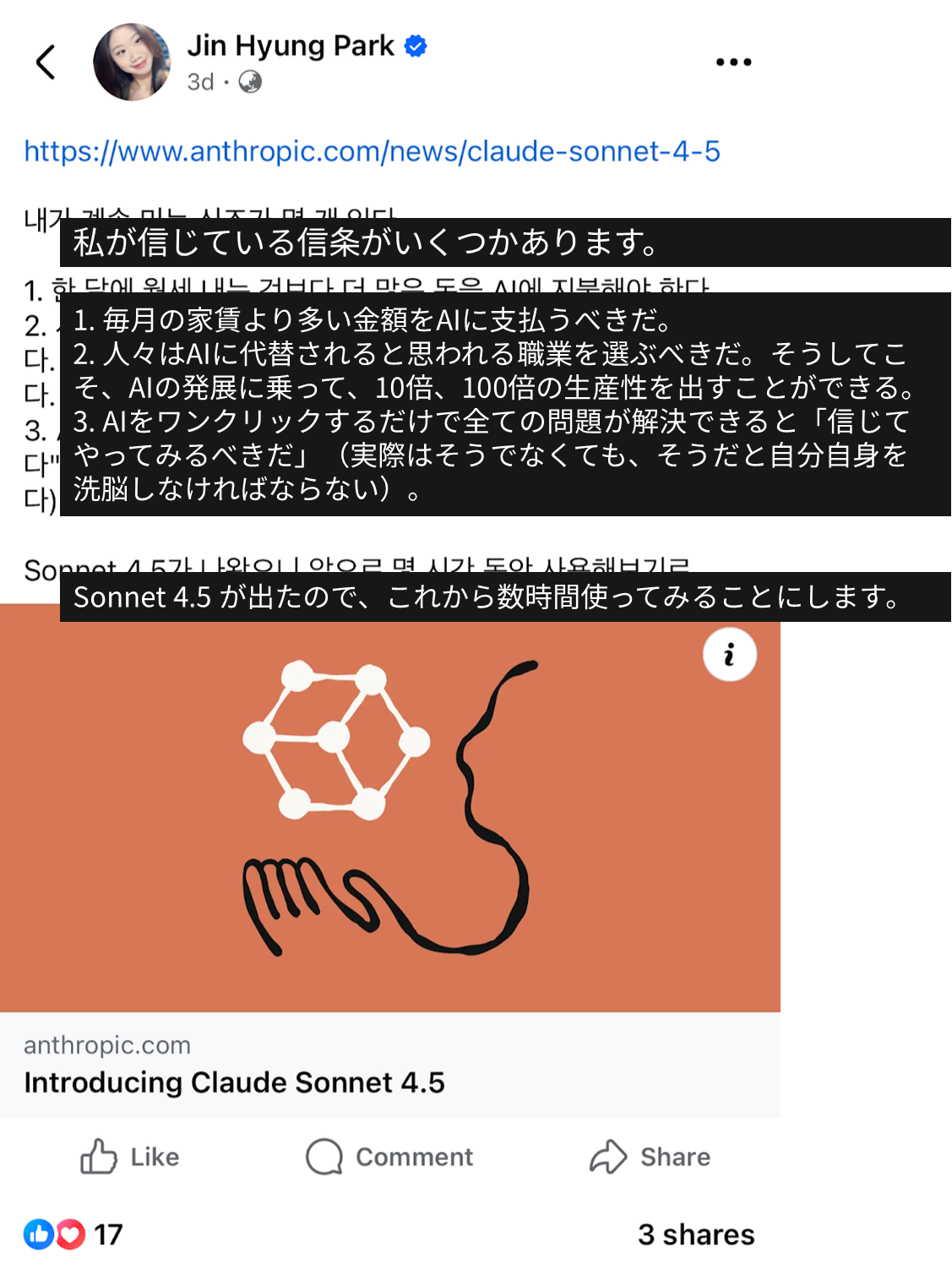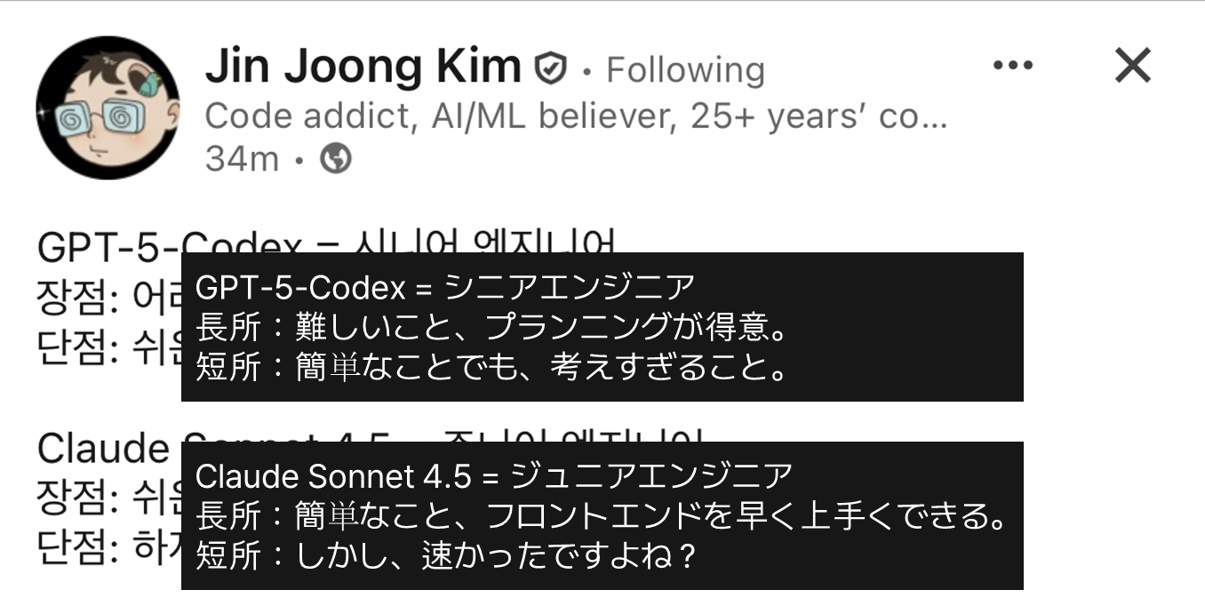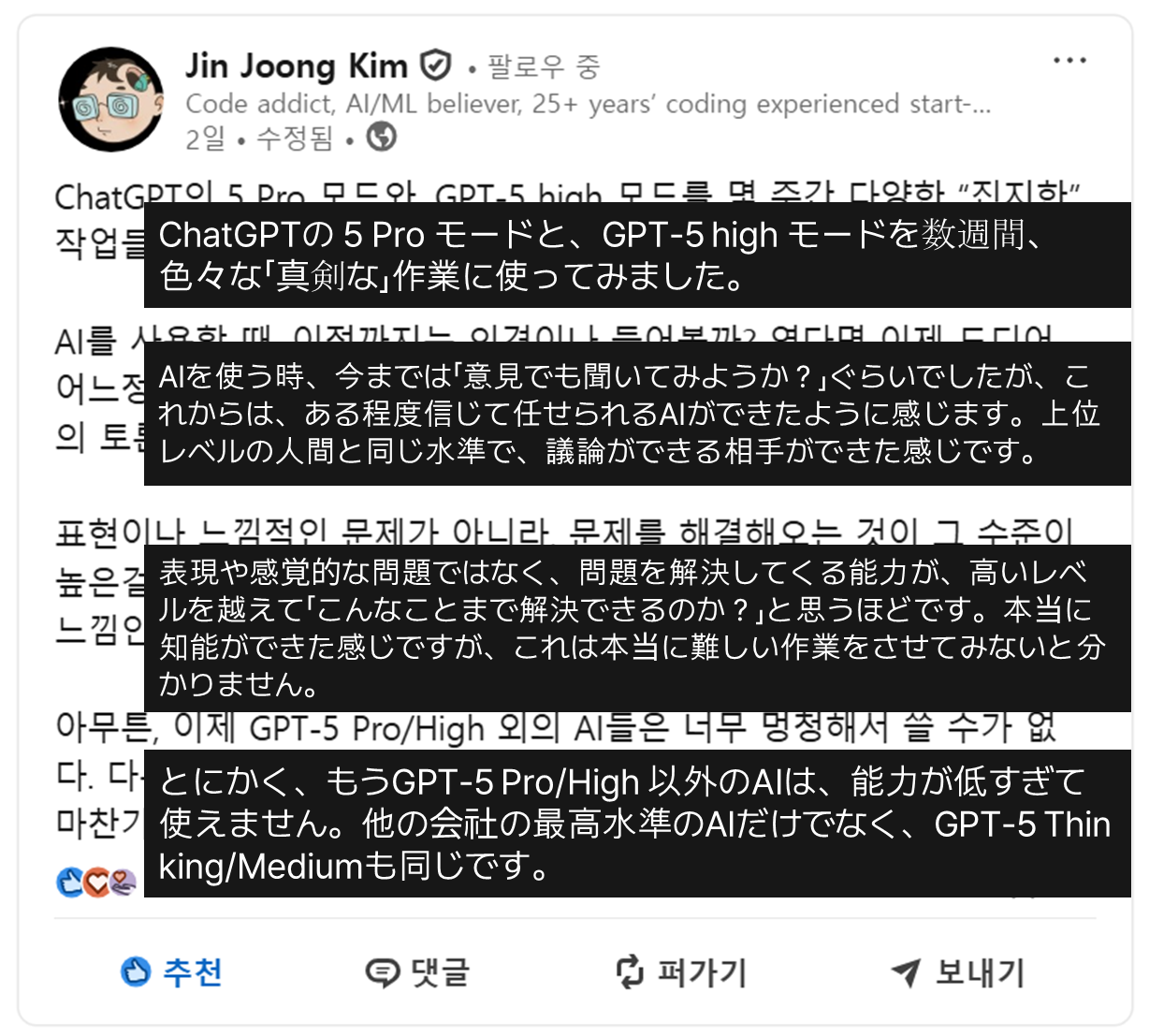 GPT Pro プランを契約するかどうか迷っていたとき、韓国で AI 分野に詳しいある方が LinkedIn に投稿していた以下の文章を読んだのがきっかけで、すぐに GPT 5 Pro モデルを契約しました。